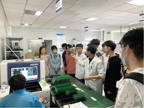 (潘勋勇老师带学生参观电子工厂生产线)