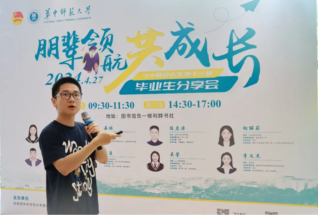 晏祖深知,光有远大的理想抱负是远远不够的,仰望星空的同时还需要脚踏实地,才能够实现自己的梦想,而大学正是为有志向的年轻人提供了实现梦想的广阔舞台。于是,进入大学以来,晏祖一直把专业学习放在首位,希望在大学当中学到真知识,掌握真本领。经过不懈努力,晏祖连续三年获得国家奖学金,三年总平均学分绩专业第一。在取得这些成就的同时,他不忘自身是一名共产党员,理应更好地发挥自身先锋模范作用,为广大学弟学妹们树立榜样,将自身好的学习方法、取得的经验教训传授给大家,帮助大家少走弯路。于是,晏祖在年级、学院、学校等各级单位当中积极进行宣讲,包括学习方法、保研升学、专业介绍等主题,给其他同学答疑解惑、传授经验。例如,在校学生会举办的“朋辈领航共成长”华中师范大学第十一届毕业生分享会中,晏祖做了主题为“时见疏星渡河汉——我的成长之路”的分享,将他成长路上的经验教训融入成长的故事中分享给大家,帮助大家更好地找到自己的前进方向。除宣讲活动外,晏祖还积极配合学院、学校的宣传工作,多次在微信官方公众号推送中传授他的学习、升学等经验,分享他的成长故事。