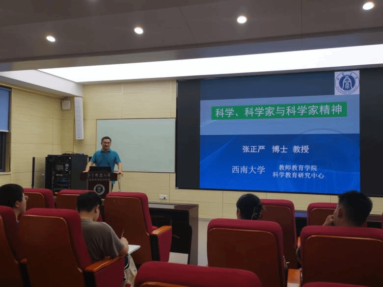 6月20日晚,西南大学教师教育学院副院长张正严教授莅临我院,在9号楼9557报告厅为师生开展了《科学、科学家和科学家精神》主题讲座。张教授以深厚的学术功底和生动的语言,从科学哲学的发展历程,探讨科学的内涵;从科学史的视角,揭示科学家的群体特征与精神品格;从科学教育的角度,探讨中小学科学家精神进校园行动的时代价值、存在问题与对策建议。