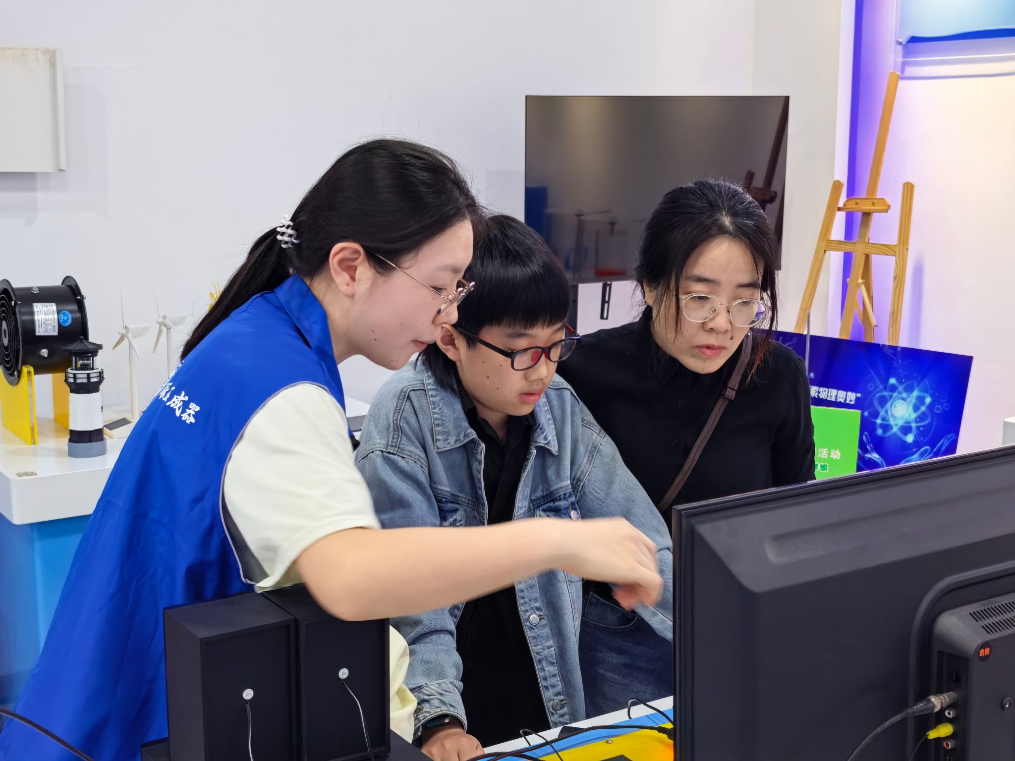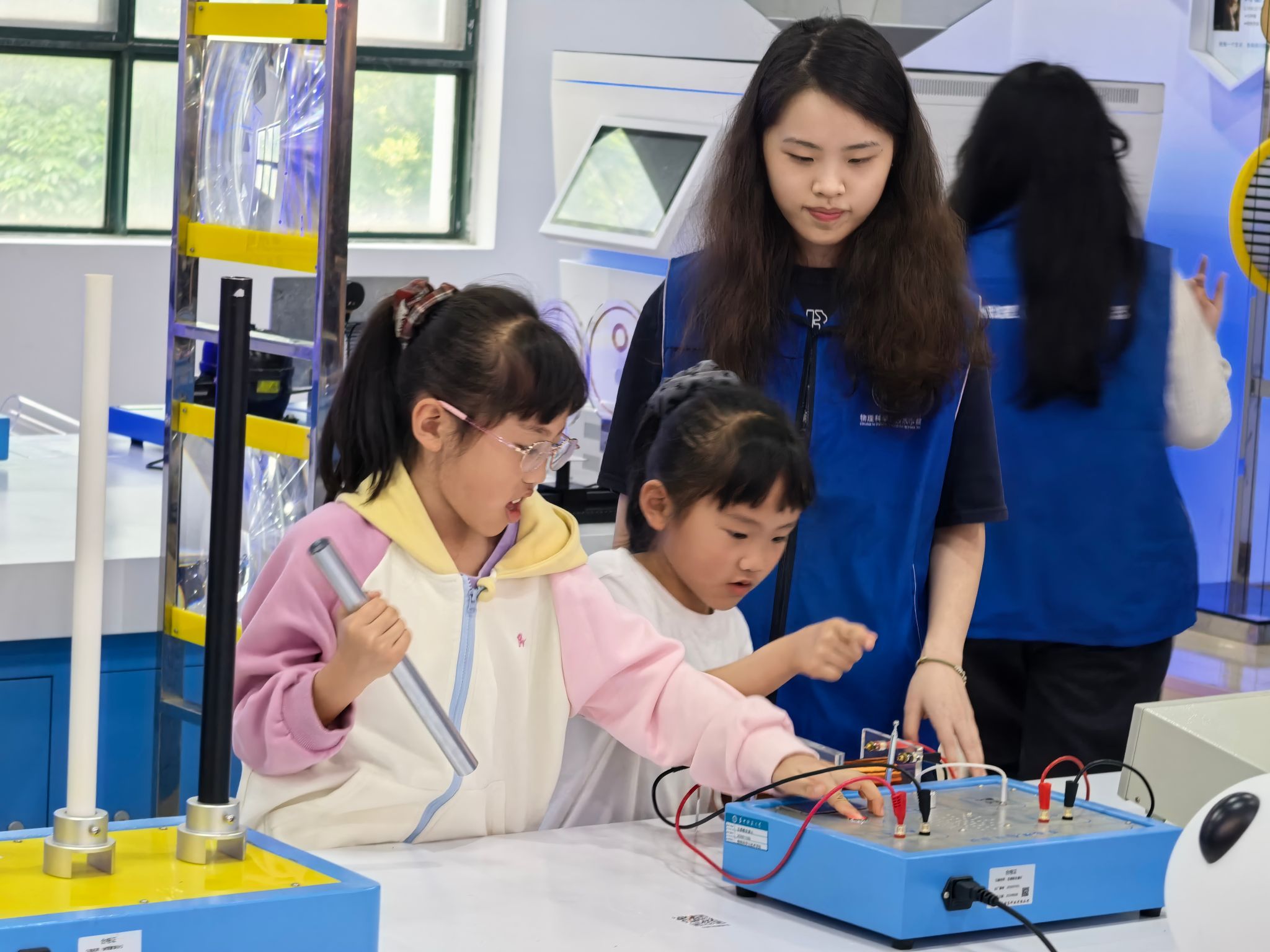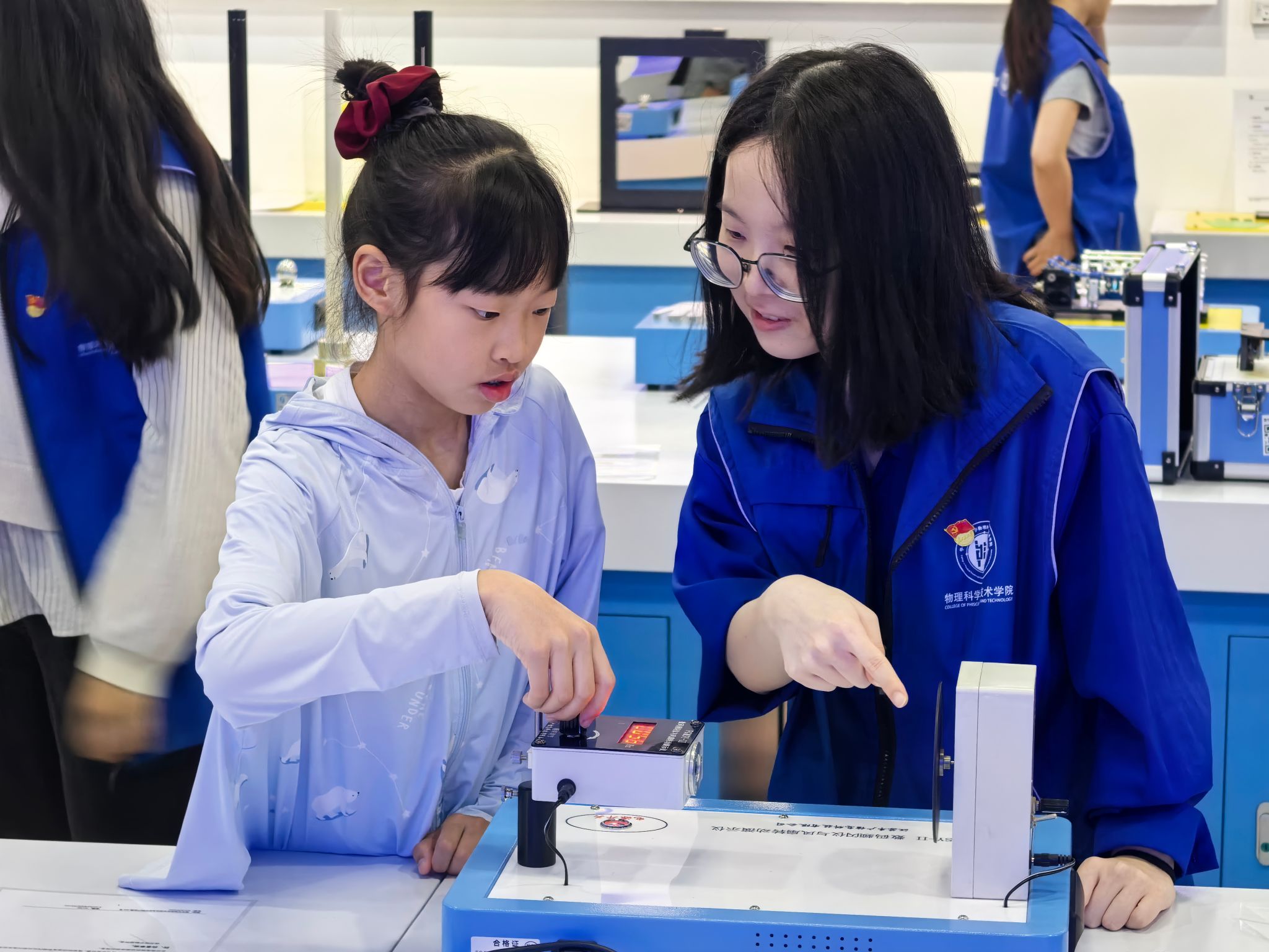 实验室里,一场别开生面的科普体验活动正在如火如荼地进行。孩子们的好奇心被各类物理科普仪器瞬间点燃,他们围在展台前驻足观察、小声讨论,稚嫩的脸庞上写满了对科学世界的无限遐想。对于孩子们的奇思妙想,党员志愿者们俯身倾听、耐心回应,一边用通俗的语言拆解实验背后的物理原理,一边引导孩子们近距离观察仪器并指导他们亲自动手实验,让孩子们在奇特的物理现象和动手实践中,初步感知物理世界的奇妙规律,进而点亮他们心中的科学火种。