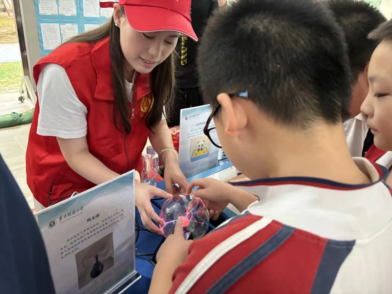 在活动中,我发现小朋友们对未知的事物充满好奇,相比于严谨和深奥的科学原理,我们在科普中更该注意演示的趣味性,使用简单易懂、有趣诙谐的方式吸引小朋友的注意力。例如人体导电演示中,我们会让小朋友叫上他的好朋友手拉手,一同触摸金属手柄,观察实验现象。再例如楞次定律的演示中,我们不讲磁通量的变化,而是告诉小朋友,有一股“能量”将金属环弹射起来。