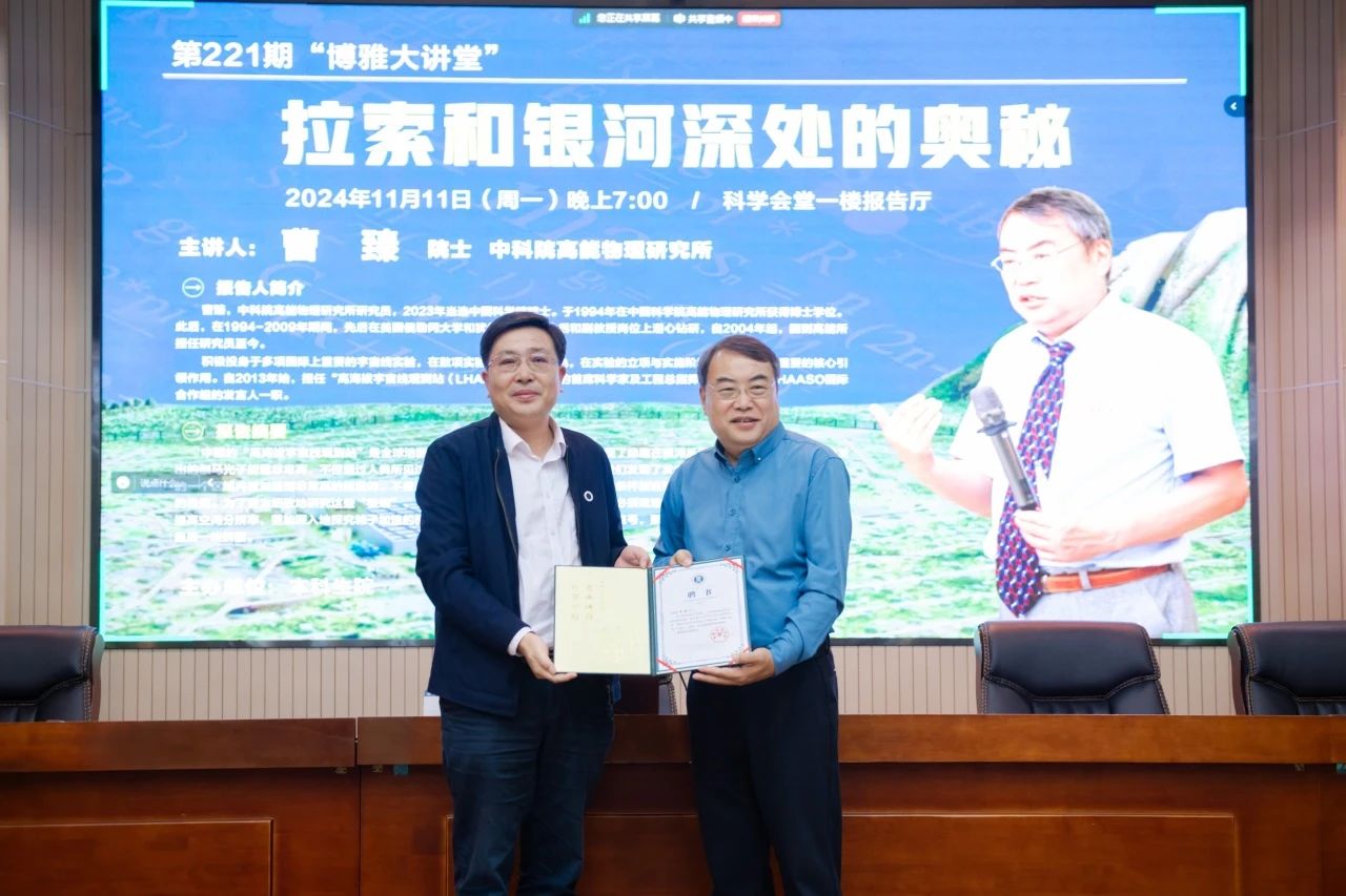 11月11日,中国科学院院士、中国科学院高能物理研究所研究员、“拉索”首席科学家曹臻院士作客华中师范大学第221期“博雅大讲堂”,在科学会堂一楼报告厅为我校师生带来“拉索和银河深处的奥秘”专题讲座。副校长刘宏达出席报告会并为曹臻院士颁发“博雅大讲堂”主讲人聘书。物理科学与技术学院师生四百余人到场聆听报告,本期大讲堂由王新年教授主持。